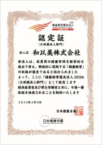 令和8年3月9日付で、経済産業省と日本健康会議が共同で実施している『健康経営優良法人2026(大規模法人部門)』に認定されました。